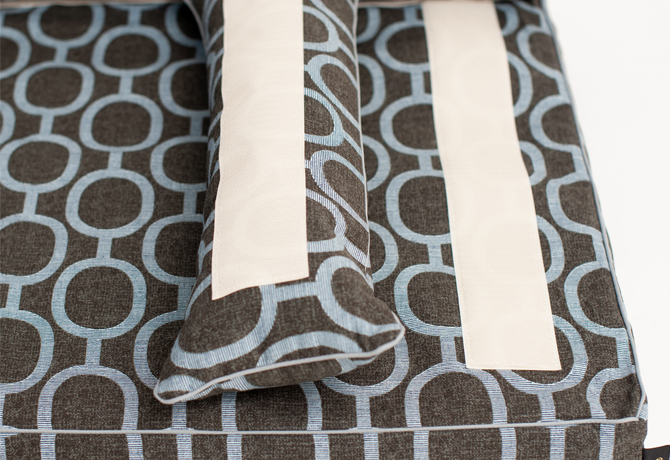 吸湿性・耐久性に優れた天然素材であるコットンリネンを上面・側面・クッション部に、光触媒機能を備えた綿100%生地を底面に使用しています(※「光触媒機能」については下記をご覧ください)。コットンリネン(綿 80%、麻 20%)は、麻 100%と比較すると、ふんわり感があり、しわが気になりにくく、型くずれにも強いのが特徴です。生地は上質で安心の日本製です。