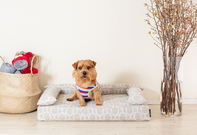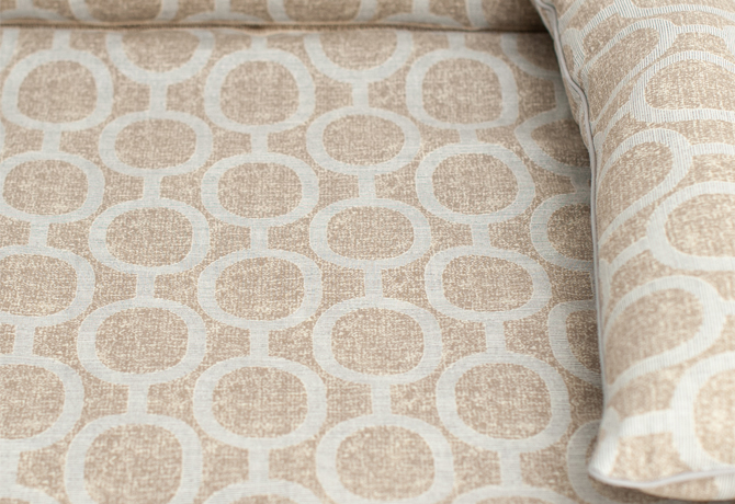 吸湿性・耐久性に優れた天然素材であるコットンリネンを上面・側面・クッション部に、光触媒機能を備えた綿100%生地を底面に使用しています(※「光触媒機能」については下記をご覧ください)。コットンリネン(綿 80%、麻 20%)は、麻 100%と比較すると、ふんわり感があり、しわが気になりにくく、型くずれにも強いのが特徴です。生地は上質で安心の日本製です。