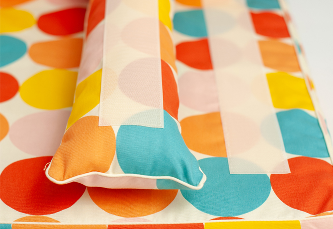 クッション部分は、強力なマジックテープでベッドカバーに固定されています。取り外してお洗濯が可能です。クッションの中素材は、帝人クリスター(ポリエステル綿)を採用しています。繊維の中心部が空洞となっており、また、スパイラル形となっているため、優れた通気性、弾力性、へたりにくさを実現しています。